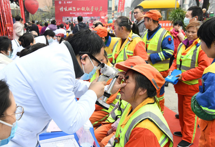《为环卫工义诊》2025年12月19日上午,重庆市沙坪坝区磁器口,医务工作者为环卫工义诊。