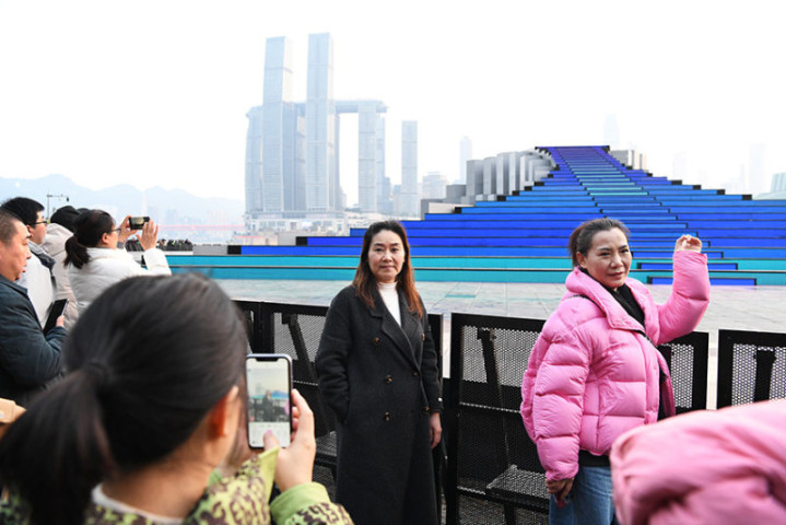 《市民喜游春晚分会场》2025年2月4日,重庆市南岸区南滨路,市民们正兴致勃勃地在央视春晚重庆分会场搭建的舞台与灯光前拍照留念。