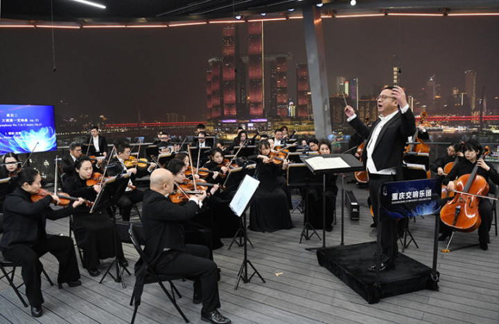 《奏响重庆之夜》2025年12月6日晚,重庆大剧院外,重庆交响乐团演奏世界名曲。