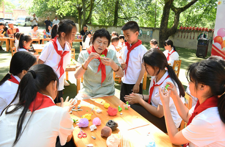 《学非遗技艺欢度儿童节》2025年5月29日,重庆市巴南区,重庆市面塑非遗代表性传承人明三娘正手把手教学生们学习面塑技艺。