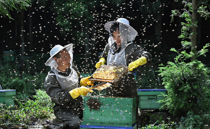 《村民采蜜忙》2025年8月29日,重庆市万盛经开区黑山镇北门村,养蜂户们正在进行蜂蜜采收。