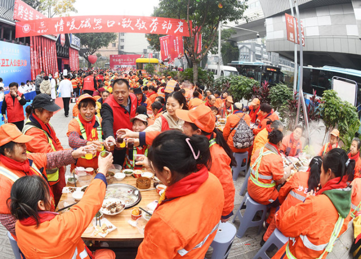 《温暖环卫工的聚餐》2025年12月19日冬至前夕,重庆市沙坪坝区,全国优秀农民工张世文连续第21年自费邀请环卫工人共进午餐。热气腾腾的羊肉汤锅不仅驱散了冬日的寒冷,更传递了一份持续二十余载的温暖心意。