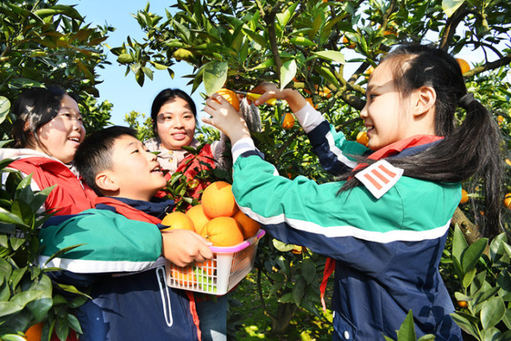 《田间课堂》2025年12月5日,重庆市璧山区,来自城区的同学们体验采摘脐橙。